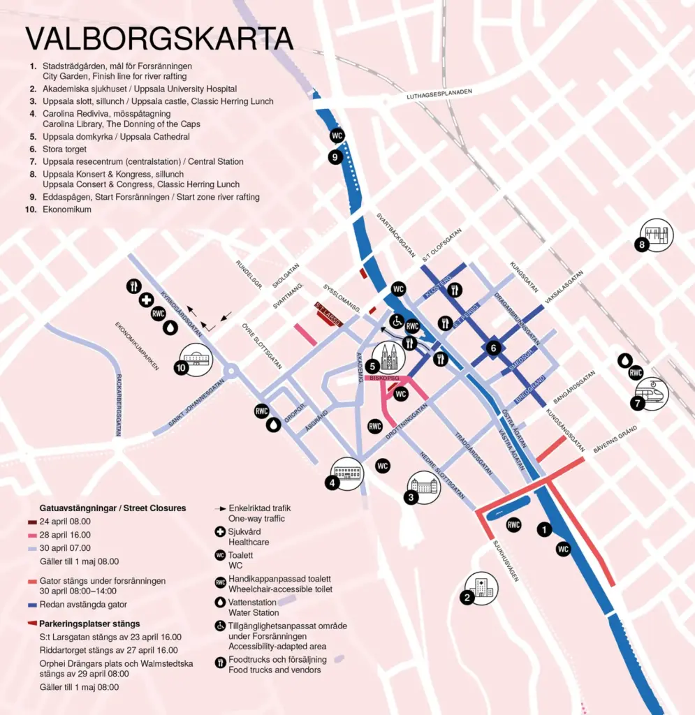Discover important areas for the festivities, street closures, toilets and water stations. Here’s the map of central Uppsala during Walpurgis.